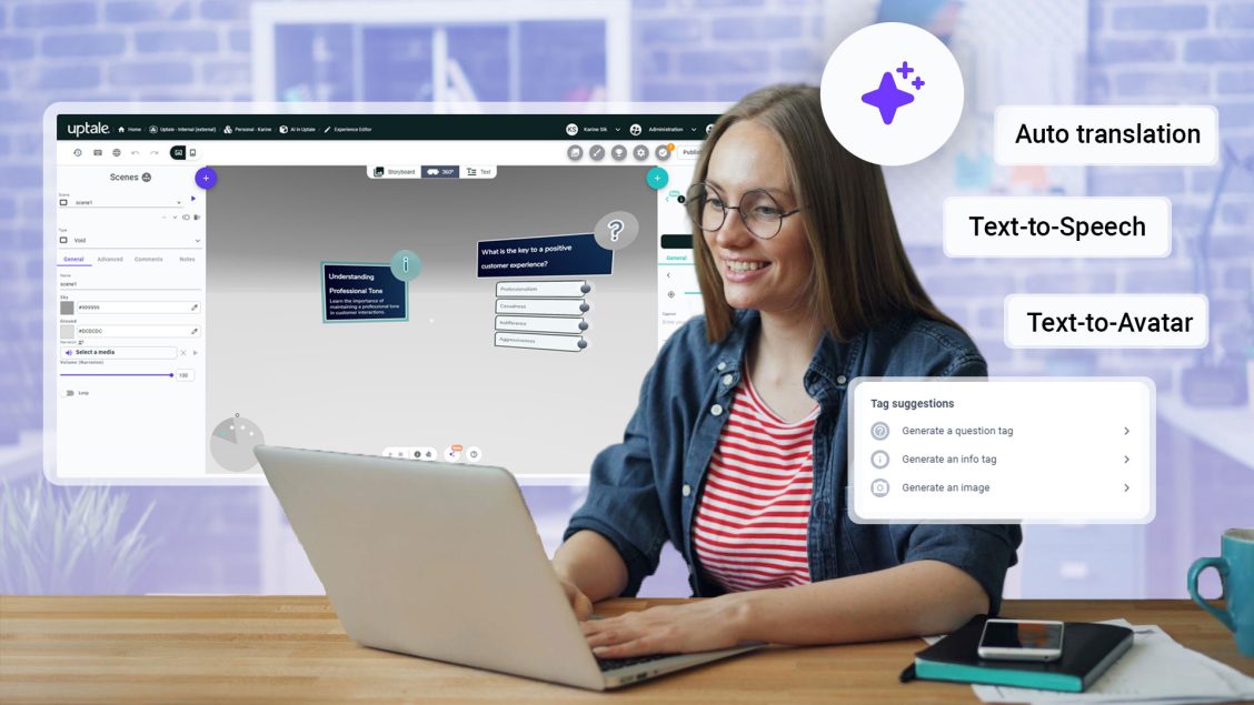 Automatisation, génération de contenus et assistance intelligente pour transformer vos idées, documents et supports existants en expériences immersives de qualité.